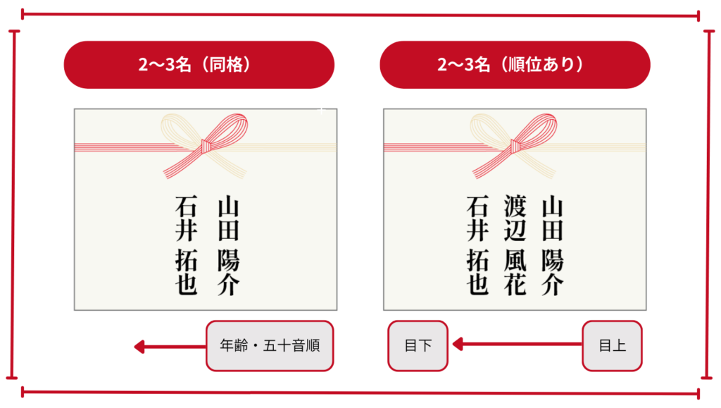 | 2~3名(順位あり) | フルネームで全員記載 | 右端に最も目上の人の氏名を書き、順に左へ並べます。 |