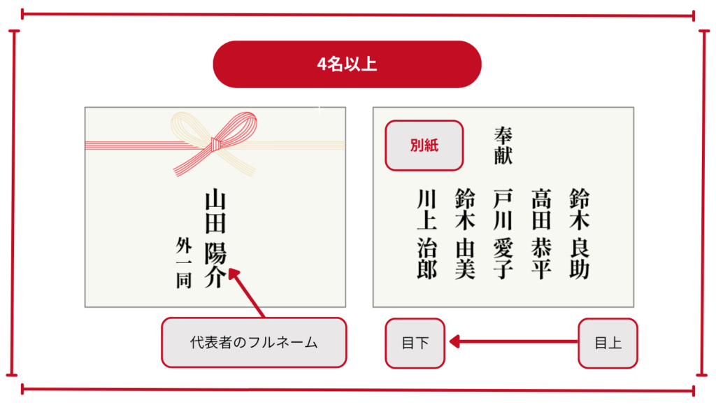 贈り主が4名以上の場合は中央に代表者のフルネームを記載し、その左側に小さく「外一同」と書きます。誰が贈ったのかがわかるよう、全員の氏名を記した「別紙(奉書紙や白紙)」を添えるのが丁寧なマナーです。