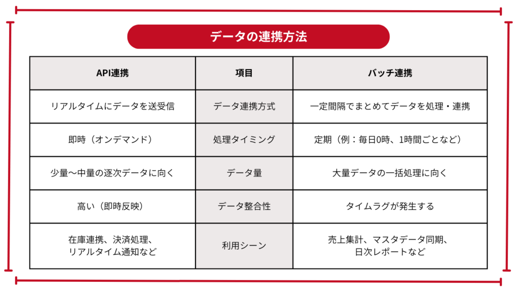 ECサイトと通販サイトのデータを連携させる方法は大きく分けて2種類存在し、それぞれに扱いが向いているデータ、特徴が存在します。それぞれの方法を見ていきましょう。