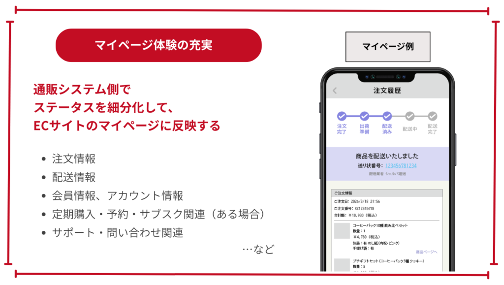 購入者の「マイページ体験」は顧客満足度に直結します。通販システム側でステータスを細分化し、ECサイトのマイページに反映しましょう。